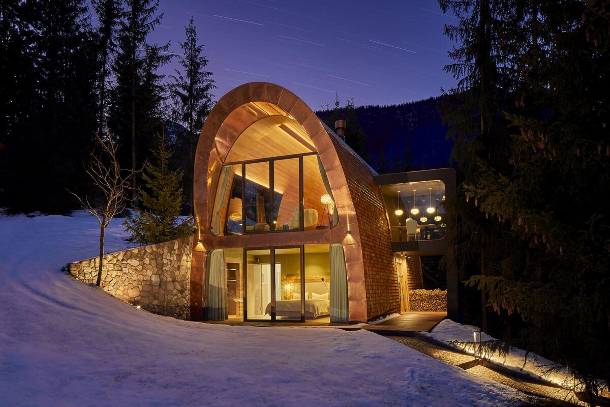 The open-plan living area offers a welcoming space to unwind after a long day on the slopes. Relax by the featured wood-burning fireplace, snuggle on the sofa, as you gaze out of the large floor to ceiling window framing the snow-capped mountain landscape outside. As the sun sets in the evening, enjoy the “Enrosadira”, the red shimmer of sunlight that is reflected on the Lavarella and Santa Croce mountains, spilling into the room. In the evening, let your nominated cook showcase their culinary skills, before retreating to your own private glass pod to indulge on your tasty cuisine.